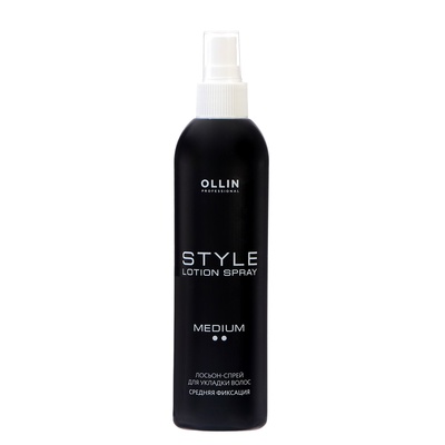Перед укладкой на высушенные локоны наносят небольшое количество лосьона-спрея для укладки волос Style Lotion-Spray Medium Hold. Затем, приступить к укладке со средством от компании OLLIN Professional.
